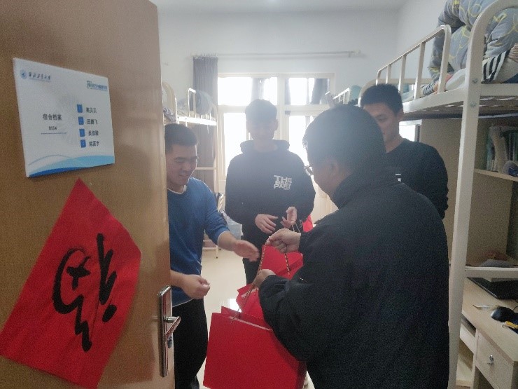 院长王占学教授、2020级本科生辅导员赴海天苑学生公寓慰问2020级能源动力类本科生,在2020年的最后一天向同学们赠送了学院精心准备的本子、瓜子、水果等慰问品,并向同学们致以新年的问候。
