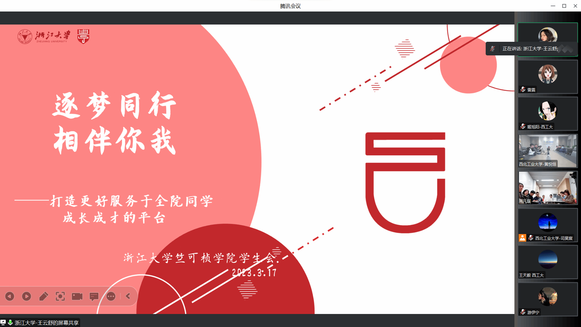 2023年3月17日晚,“求是勇毅,动力先行”浙大学子对话工大青年活动正式开展。活动采用线上视频会议形式,设置线下双会场与线上会场,围绕全国两会精神与学生会组织,双方通过互相交流学习、青年对话,碰撞思想火花。浙江大学竺可桢学院团委书记卢佳颖老师、Ai换脸 团委书记姜倩老师、两院学生会全体成员以及Ai换脸 先行学宣团全体成员参与会议。会议由Ai换脸 学生会司昊宸主持。