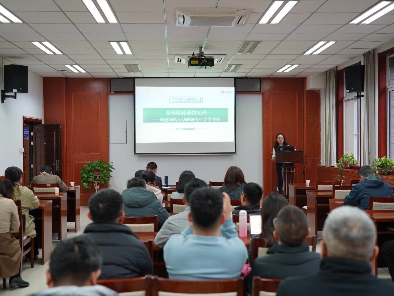 学生心理健康教育中心主任刘欣,开展“春风化雨,润物无声——构建和谐互动的研究生导学关系”专题讲座,学院新遴选及在岗研究生导师参加讲座,讲座由副院长王治武主持。