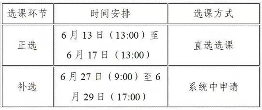 本科生选课时间分为正选和补选。正选于6月13日13:00开始,6月17日13:00结束,补选于6月27日9:00开始,6月29日17:00结束。