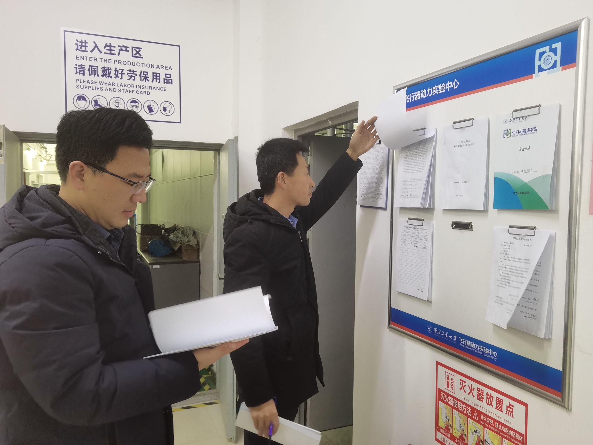 首先,安全检查小组到爆震推进实验室、燃烧实验室、叶栅实验室、先进航空动力润滑与空气系统实验室、动力机械寿命及可靠性实验室、传热及冷却实验室、吸气时高超声速推进系统实验室和通航/无人系统动力工程中心进行了检查,重点围绕实验室的危险源进行了安全检查。检查了实验项目风险评估报告、实验记录登记、危化品使用台账、特种设备管理、以及实验室的日常管理情况。检查中高文君对学生强调,要从思想上提高安全意识,开展实验前一定要考虑到实验中潜在的安全风险,熟悉应急预案,不清楚的多向老师请教,实验过程中一定要做好相关区域内的警戒,确保人员安全和设备安全。