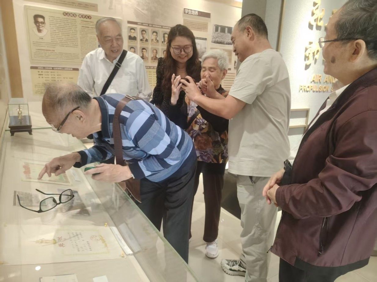 随后,两位校友在陪同下来到了学校的军工素质教育实践中心。在军工素质教育实践中心的户外停机坪上,陈列的多型战机实物见证了学校在相关领域的深耕,施老师重点讲述了学校与国防事业发展同频共振的历程。参观过程中,老校友们不时驻足交流,回忆在校求学时的点滴,感慨校园环境与办学条件的巨大变迁。