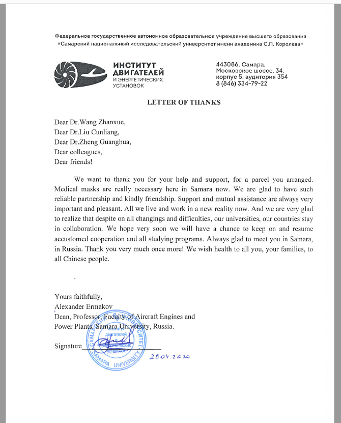 萨马拉航空航天大学发来的感谢信