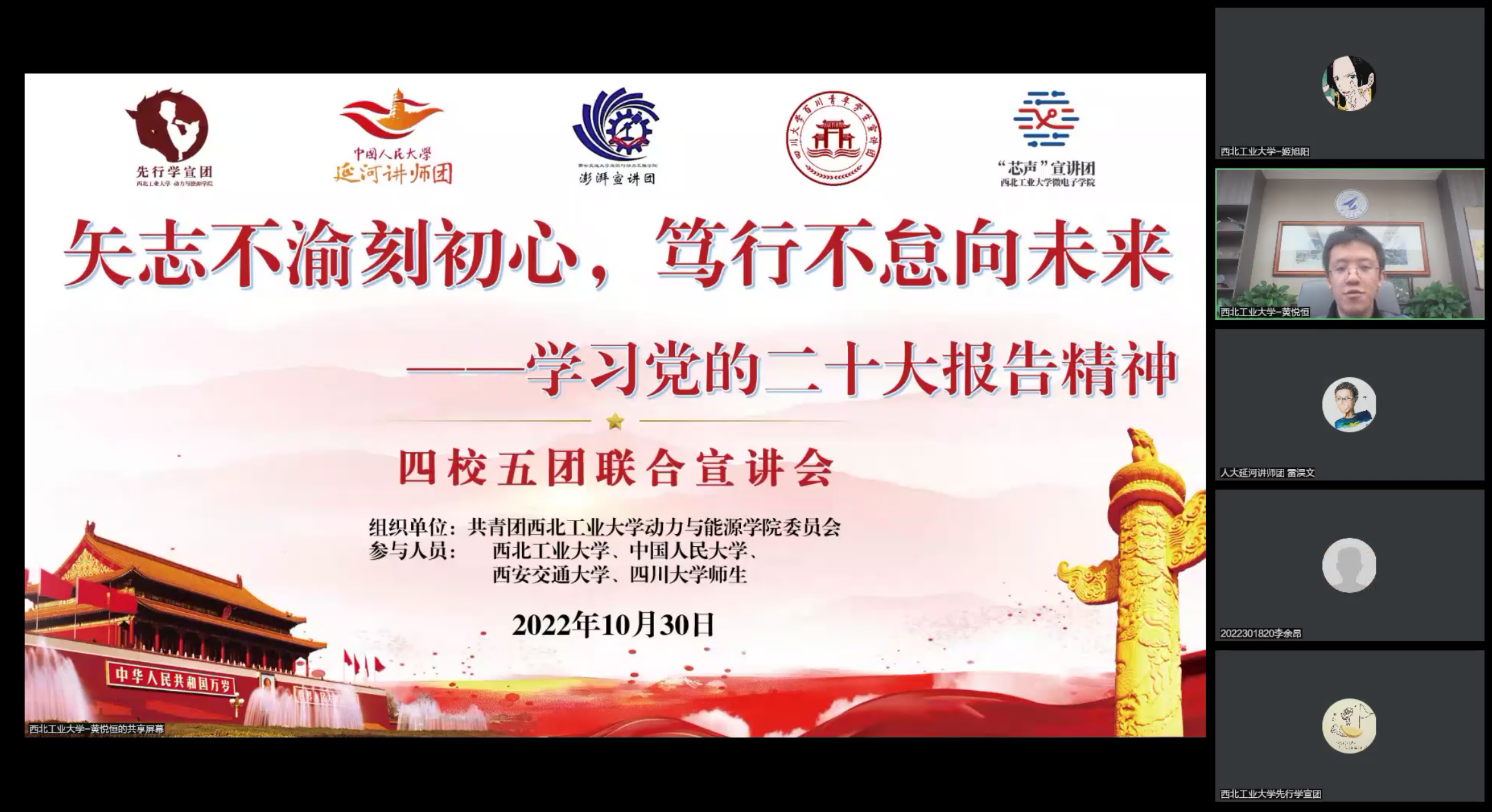 先行学宣团,分别邀请中国人民大学“延河讲师团”、西安交通大学能源与动力工程学院澎湃宣讲团、四川大学百川青年学生宣讲团、Ai换脸