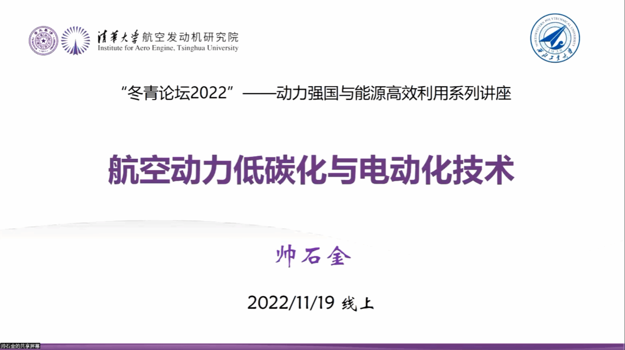 冬青学会郭恒杰教授邀请,清华大学航空发动机研究院党工组组长、副院长,清华大学壳牌清洁交通能源中心主任帅石金教授针对《航空发动机低碳化与电动化技术》进行了一场系统且详实的学术报告。多所著名高校及科研院所的专家、老师和研究生共计百余人次参与报告,论坛由动力与能源学院杜昆副教授主持。