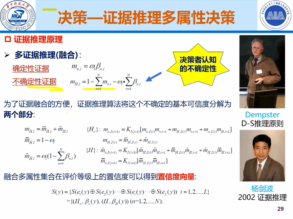 然后,针对电网决策难度大的问题,李远征副教授提出证据推理多属性决策的方法。新型电力系统自动化水平更高,优化调度决策逐步向全面自动闭环发展。运行方式多变,不确定性水平高——调度人员知识和经验积累跟不上新型电力系统发展。传统决策方法存在不足:在决策方法方面没有考虑多属性之间的权重关系,在距离方法方面计算量较大而且会“扭曲”相关信息顺序结构,在评估方法方面没有考虑决策者认知的不确定性。为此,李远征副教授提出基于证据推理方法解决电力系统多属性优化决策问题,并提出详细的多层评估框架来执行证据推理,为实际的电力系统多目标调度提供科学参考。