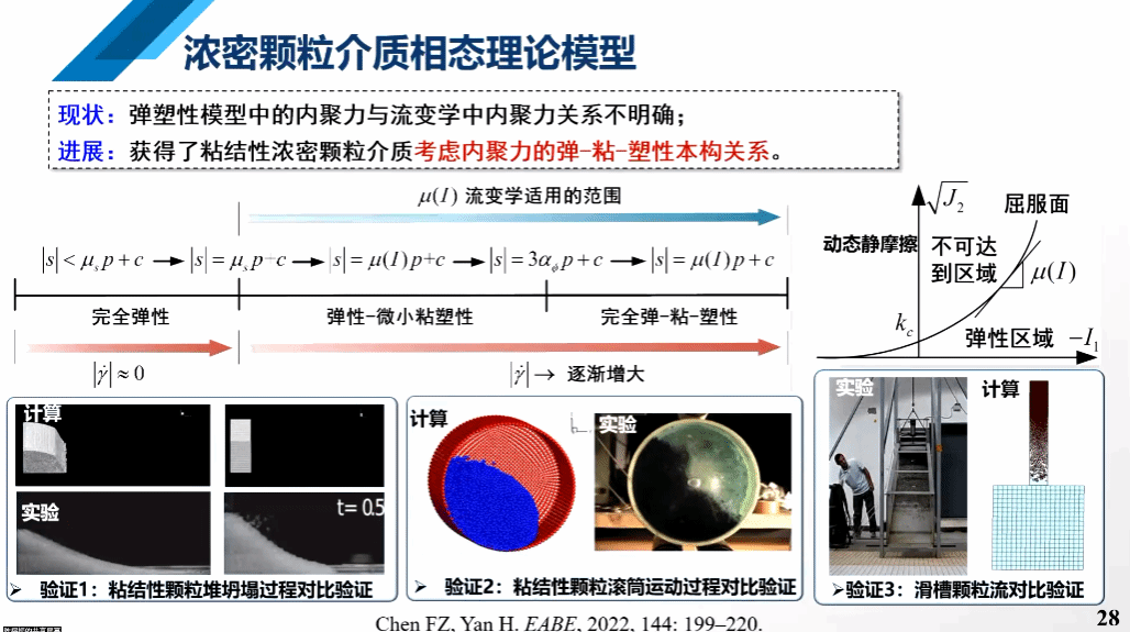 接下来陈福振教授介绍了颗粒介质相态演变机理模型。此问题的背景是发动机中的颗粒壁面的运动与沉积问题,而且与传统的气体、颗粒两相悬浮流动问题以及颗粒初始堆积问题。目前针对颗粒壁面研究方法都存在计算量过大或者计算不适用的问题,所以陈老师及其团队想从宏观角度来解决颗粒运动问题。他们将颗粒介质类固态的理想弹塑性模型和液态的粘性-塑性模型结合起来实现类固和类液两种相态的耦合计算,并在此基础上,考虑了颗粒之间的凝聚力,完善了模型理论。
