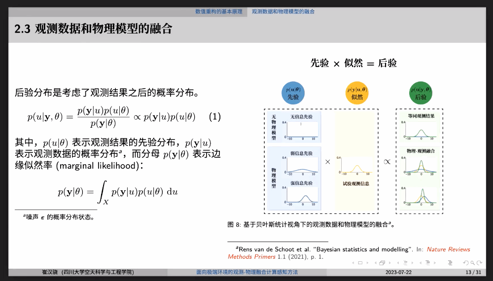 随后,崔汉骁从数据重构的基本原理基础入手,帮助与会学者了解了对有限观测结果和物理模型进行结合的关键步骤。数值重构的难点在于解决方程的病态性,其根源来自于观测过程或者物理过程导致的信息损失。对此,崔汉骁提出一方面可以对测量结果引入某种先验信息进行修正,另一方面则是利用拉格朗日法将原有的刚性约束加入物理模型进行求解。并且,他采用观测数据和物理模型的融合过程推导出了其可能的边界条件,从而借助数值仿真可以完成计算。