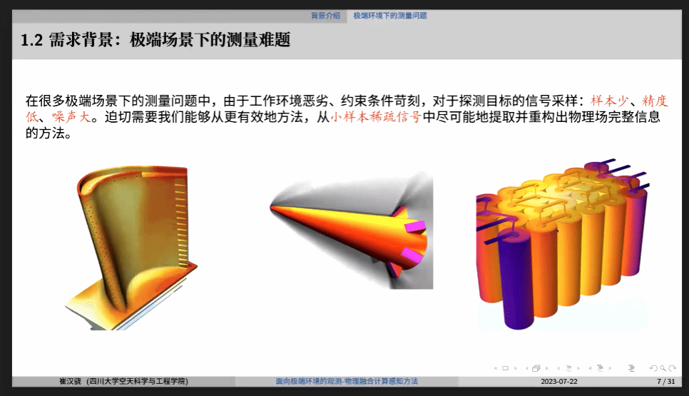 一开始,崔汉骁强调由于航空发动机研制需要漫长实验阶段,其工作环境较为恶劣,因此实验数据往往难以获得。针对极端场景下的测量问题,崔汉骁所做工作主要聚焦于如何以少量的测量样本与物理相结合的方法提取并重构物理场的完整信息,从而实现在该领域的技术突破。