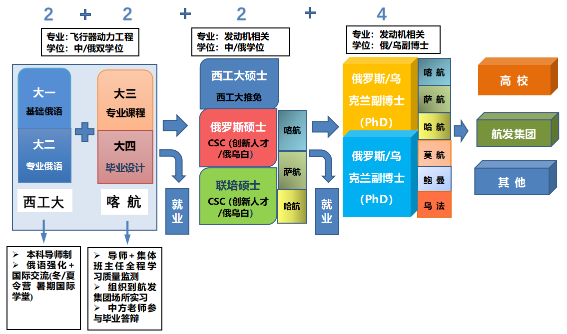 “2+2”联合培养:本科前两年在西北工业大学学习,后两年在俄罗斯喀山国立技术大学(喀航)学习,取得双方本科学位。