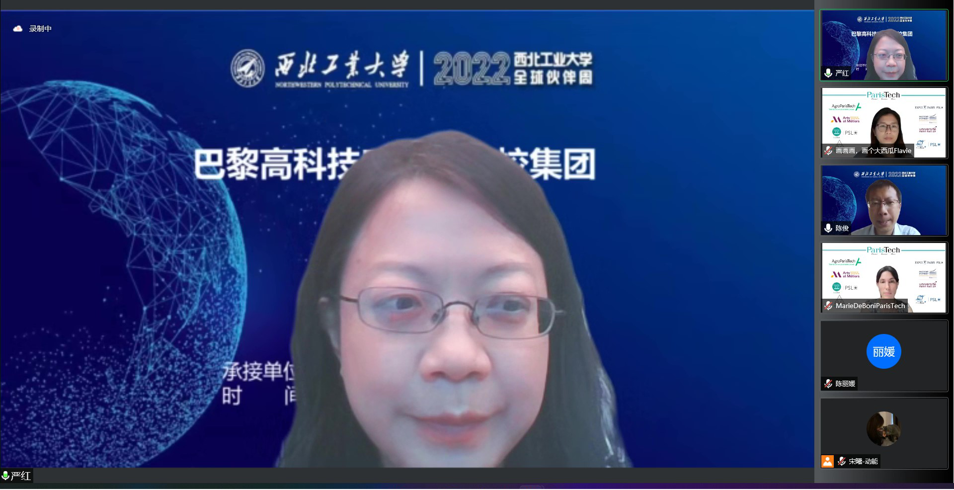 为了搭建与世界一流大学和机构的交流平台,推动学校人才工作,促进我校与国外高水平大学和机构深度合作,2022年5月24日,动力与能源学院以西北工业全球伙伴周活动为契机,于线上召开巴黎高科技工程师学校集团(简称巴黎高科)交流座谈会。巴黎高科驻华代表Marie de BONI受邀参加座谈会。我校国际合作处副处长陈俊、动力与能源学院副院长严红参加本次座谈,会议由严红副院长主持。