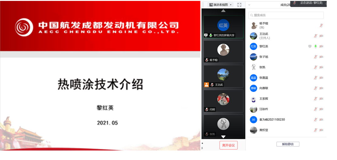 2021年5月23日,由中国航发成发一级技术专家黎红英老师主讲的“热喷涂技术介绍”专题讲座在线上举行。动力与能源学院王治武教授,以及三十余名研究生参加了本次讲座,讲座由王治武主持。