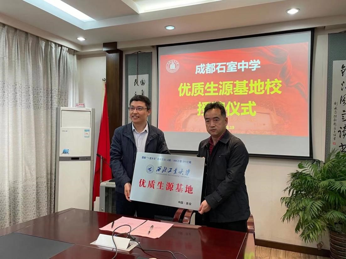 3月19日下午15时,宣传组来到石室中学进行座谈交流,石室中学副校长毛伟和教学办公室主任黄芳参与会谈。王克勤主任通报了近几年石室中学向西工大输送优质学生的基本情况,介绍了西北工业大学办学理念与特色,表达了与成都石室中学建立长期的合作愿望。毛伟副校长介绍了石室中学深厚的历史背景与文化,表示西北工业大学“培养具有家国情怀,追求卓越,引领未来的领军人才”的培养目标与石室中学“办品质教育,育核心素养,为领军人才奠基”的办学理念高度契合,非常希望能够与西工大这样有国防特色的高校加强合作交流,共同为国家培养栋梁之才。会后,王克勤主任与毛伟副校长分别代表西北工业大学与石室中学签订了优秀生源基地协议,并进行了优质生源基地授牌仪式。