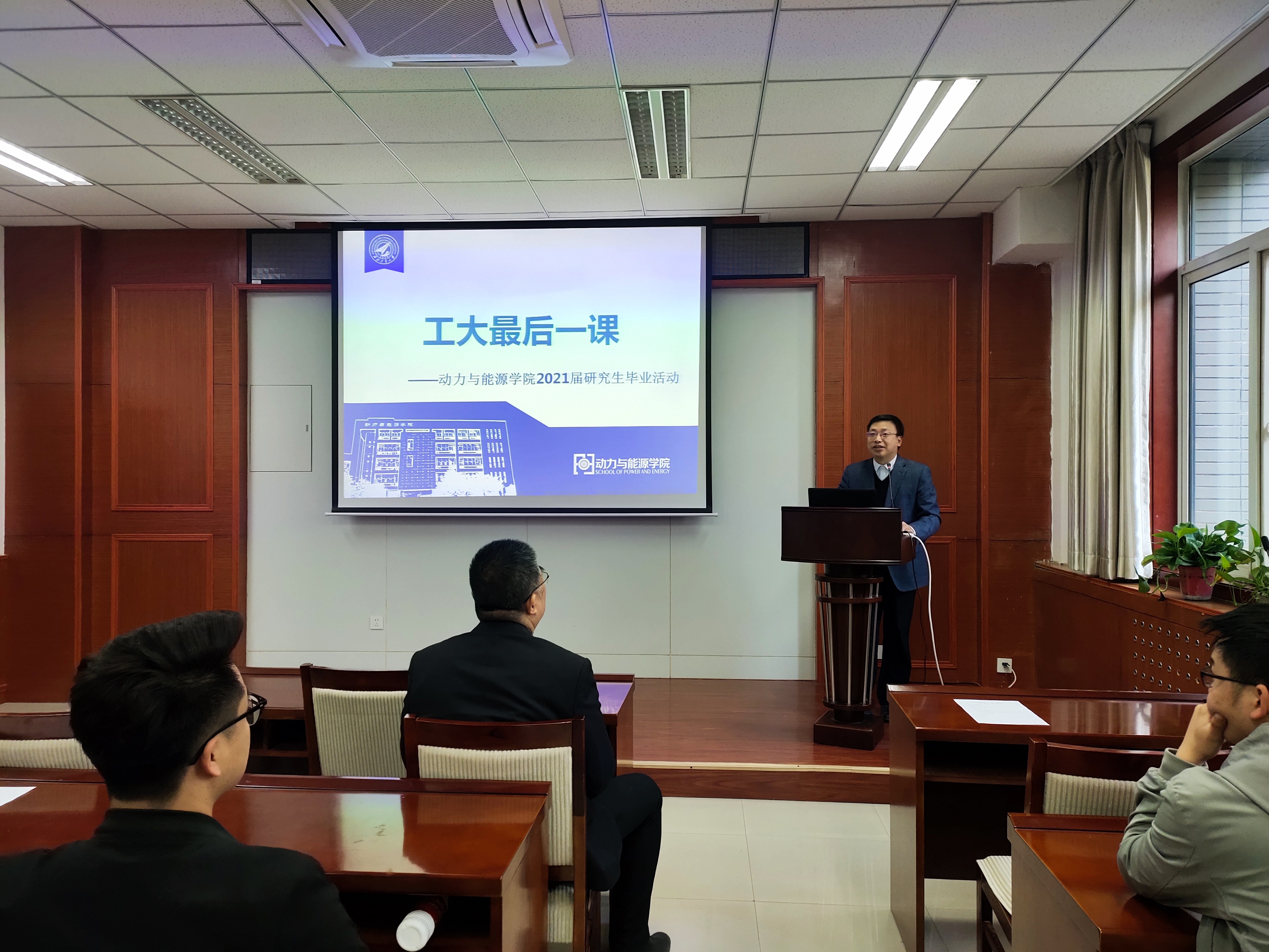 2021年3月22日上午10时,动力与能源学院2021届研究生毕业活动“工大最后一课”在学院225会议室准时开启。动力与能源学院院长王占学、党委书记闫育周、学生工作办公室主任刘海涌、研究生辅导员白晓辉和学院全体2021届毕业研究生参与了活动。