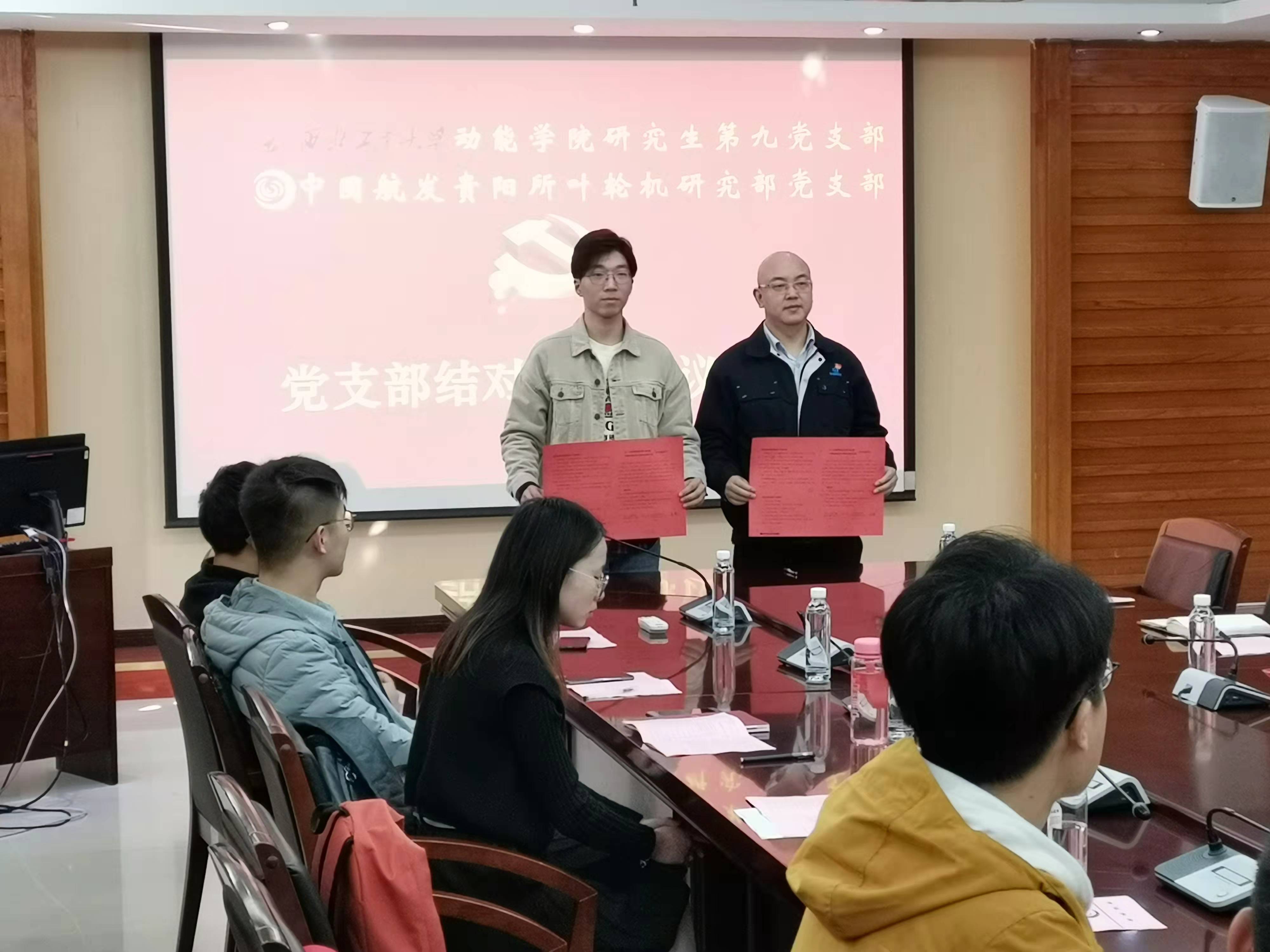 中国航发贵阳所是我国航空动力系统(即航空发动机)领域四大主机设计的航空科研事业单位之一,主要从事中等推力航空涡喷、涡扇发动机的科学研究工作。11月13日上午,中国航发贵阳所叶轮机研究部党支部与动力与能源学院研究生第九党支部于贵阳所第一会议室进行了支部共建的启动仪式。贵阳所人力资源部部长马岚同志首先对贵阳航空发动机研究所的发展概况和行业现状进行了介绍,让同学们对研究所的历史发展和工作内容有了较为全面的认识。随后,叶轮机研究部党支部书记赵熙同志与动力与能源学院研究生第九党支部书记朱安冬分别就各自支部建设情况进行了介绍,九支部的建设经验受到了在座领导们的大力肯定。为达成党支部的长久共建关系,双方支部签署了《党支部结对共建协议》,为之后的共建活动开启了一个良好的开端。