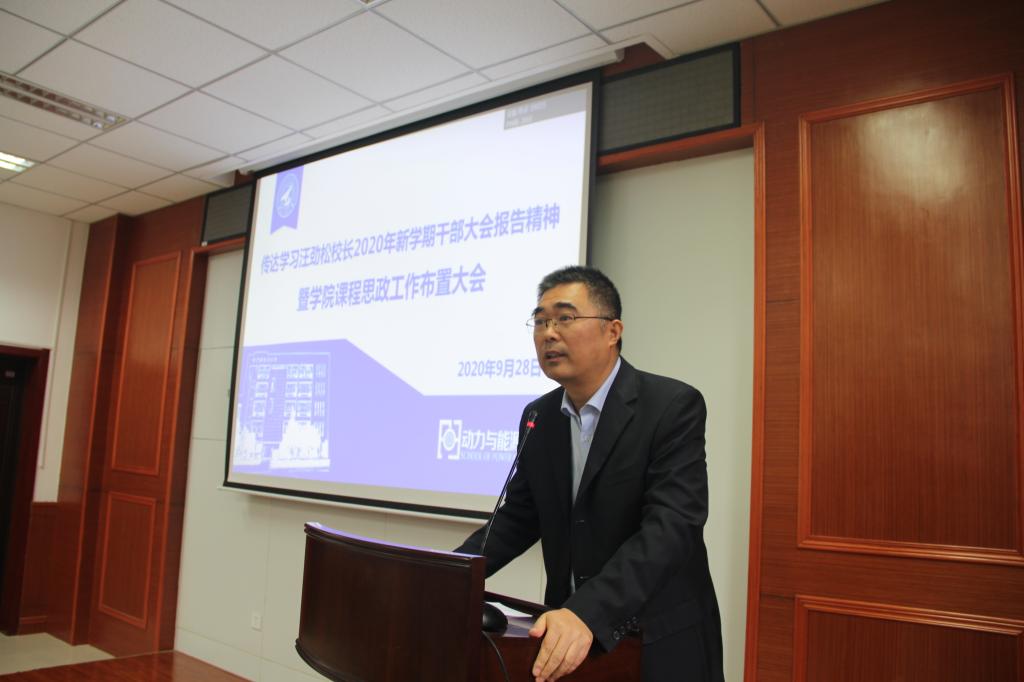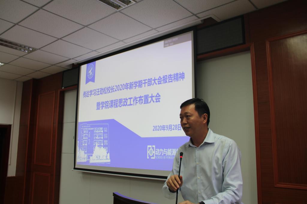 9月28日上午,动力与能源学院召开全体教职工大会。大会围绕人才培养和课程思政专题,深入学习习近平总书记在学校思政课教师座谈会、全国研究生教育会议上的讲话精神,认真贯彻落实汪劲松校长在新学期全校干部大会上的工作要求,安排部署学院人才培养和课程思政建设工作。校长助理兼教务处处长张开富、研究生院副院长查钢强出席会议,全院教职工参加了此次会议,会议由闫育周主持。