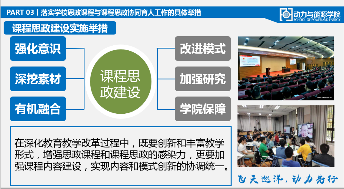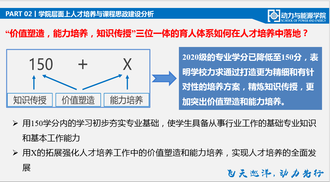 首先,王占学做了题为《以课程思政为抓手,强化三全育人意识,构建动能特色的“三位一体”的育人体系》的报告,从“课程思政与人才培养间的内在联系、学院人才培养与课程思政建设分析和落实学校思政课程与课程思政协同育人工作的具体举措”三个方面解读了学院人才培养模式和课程思政协同育人的举措。他强调,学院将全力开展150+X的专业培养方案模式,用150学分内的学习初步夯实专业基础,使学生具备从事行业工作的基础专业知识和基本工作能力,把班主任和本科生导师制作为这一部分工作的主要抓手,加大班主任和本科生导师的考核力度;用X所代表的“塑魂”、“强基”、“益智”、“健体”、“拓维”为主线,强化人才培养工作中的价值塑造和能力培养,全面提升学院人才培养综合能力,提高人才培养质量。