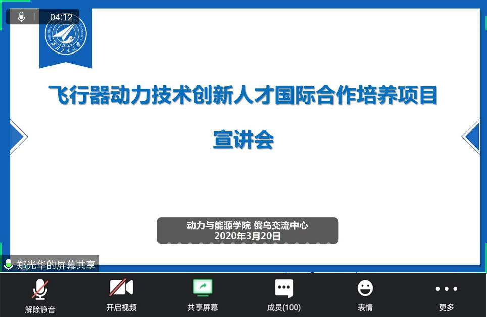 2020年3月20日19:30,动力与能源学院借助腾讯会议平台对“飞行器动力技术创新型人才国际合作培养项目”的相关内容进行宣讲。西北工业大学动力与能源学院有留学意向的100多位师生通过直播观看了本次宣讲。
