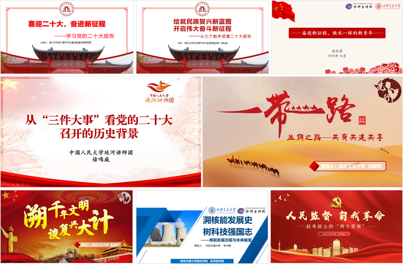 西北工业大学先行学宣团高婵娟和张艺凡同学分别以“丝绸之路”与“历史文明”为主题,为我们深入挖掘了党的二十大报告背后的故事。中国人民大学“延河讲师团”的徐鸣威同学以 “三件大事”,剖析了党的二十大的召开的历史意义。西安交通大学澎湃宣讲团的任纪霖同学强调“上善若水”的重要思想,提出“要做像水一样的新青年”。李书畅同学以“核能的发展史”为切入点,讲述了新时代大背景下“科技”对国家发展、人类进步的重要性。四川大学百川宣讲团的张耘陌同学和廖雨薏同学分别以 “九个数字” “三件大事”为我们介绍了党的二十大报告的深远意义。西北工业大学“芯声”宣讲团的沈陆辰同学讲述了党探索跳出历史周期率的两个答案的历程,展现了“人民监督”和“自我革命”在中国共产党建设和中国发展中的重大作用。