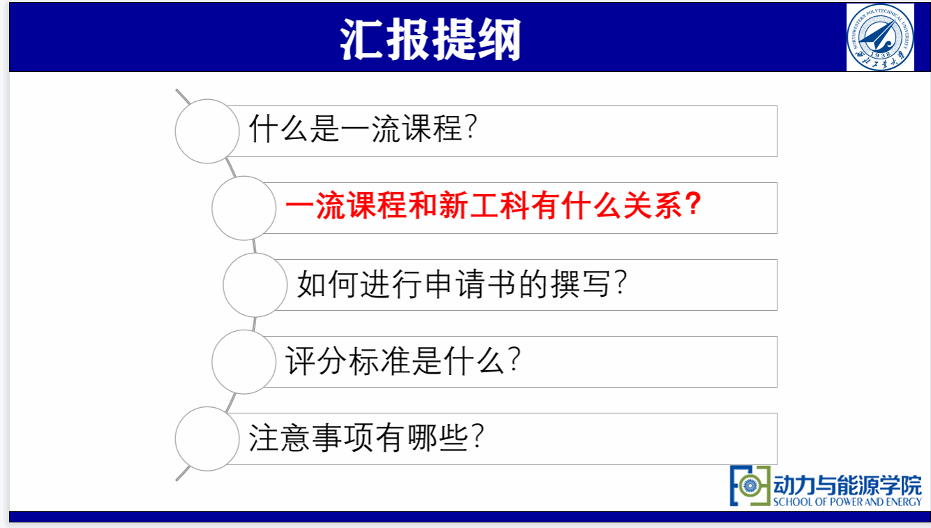 为贯彻落实《教育部关于一流本科课程建设的实施意见》精神,持续推进《西北工业大学一流本科人才培养行动计划》,加快推进动能金课建设,4月18日下午,动力与能源学院组织召开以“申报一流本科课程的一系列准备”为主题的动能金课库建设推进会。动力与能源学院教学副院长刘存良、院长助理高文君、省级一流课程负责人王俨剀老师、各专业课程课程负责人、青年教师参加了会议。