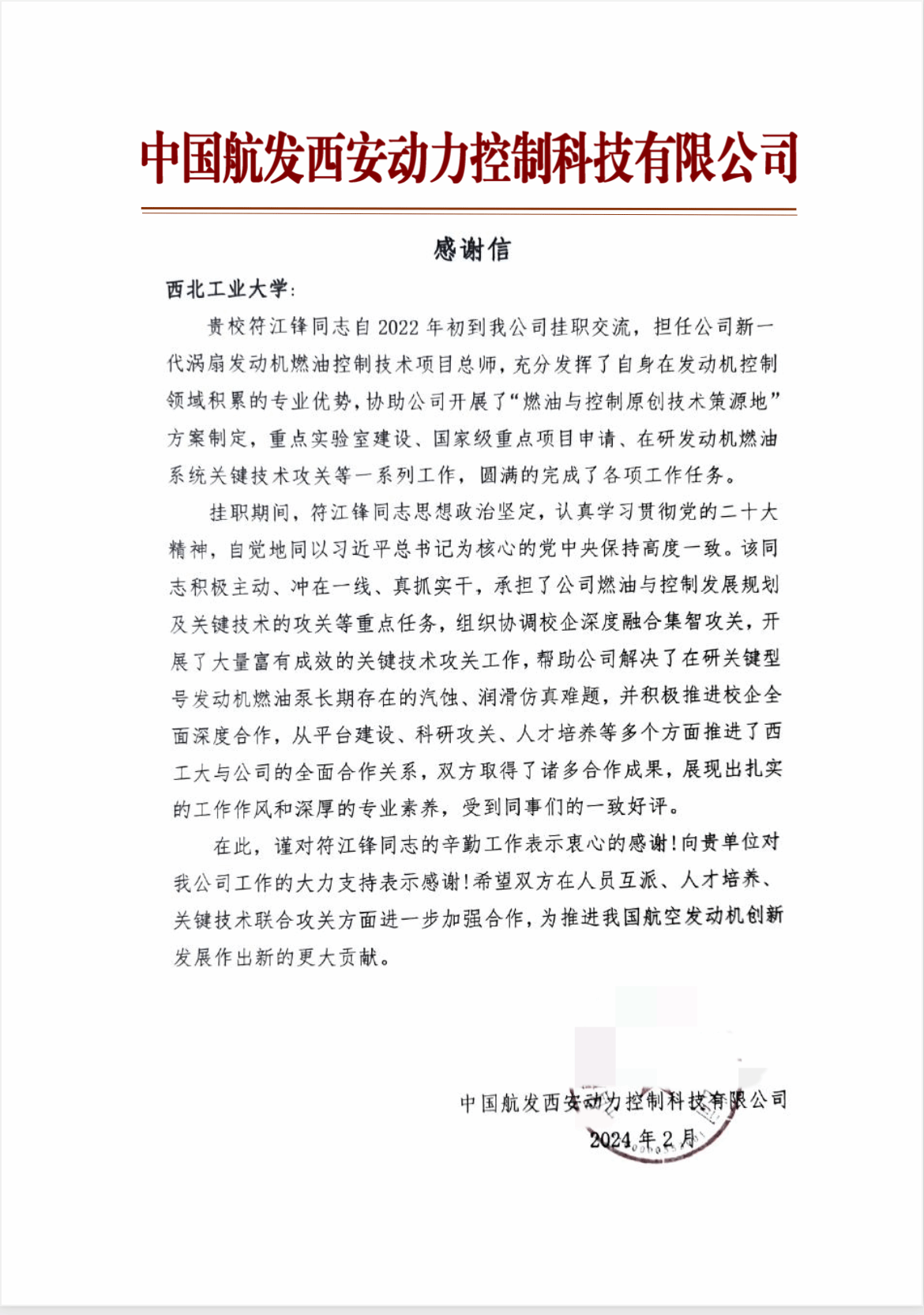 挂职期间,学校与中国航发西控科技成立了航空发动机燃油控制技术联合实验室和联合攻关团队,共同申报获批6项国家级项目,联合团队荣获中国航发集团十四五第二批“高压、高速、高效先进燃油泵创新团队”,全国仅有4所高校获批,有效推进了校企深度融合。
