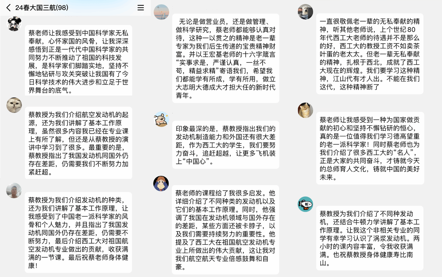 “我从蔡教授的教导中了解到西工大在祖国航发专业的重要贡献,深刻地感受到了老一辈西工大人无私奉献的精神和心怀家国的风骨。”