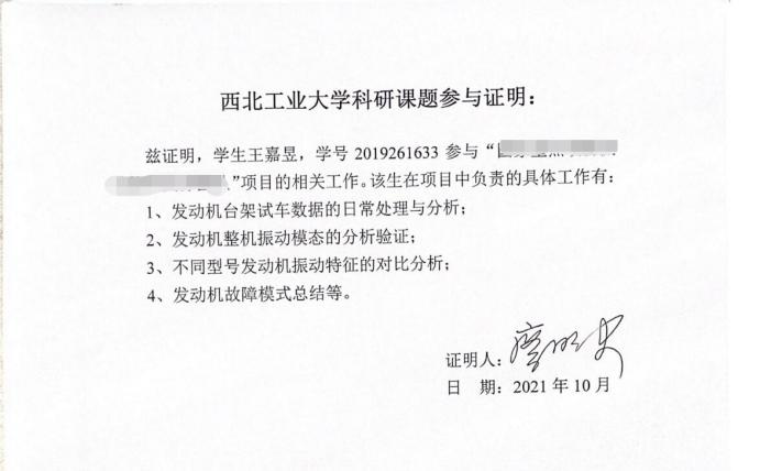 作为一名硕士研究生,通过科研学习提升自己是很有必要的。王嘉昱同学在学习上态度端正,勤奋努力,积极向身边的老师与同学们请教问题。硕士期间学习成绩良好,积极参与科学研究工作,并参与多项国家科技重大专项的研究工作,为祖国某型号航空发动机的研制改进工作付出了时间、精力与汗水。