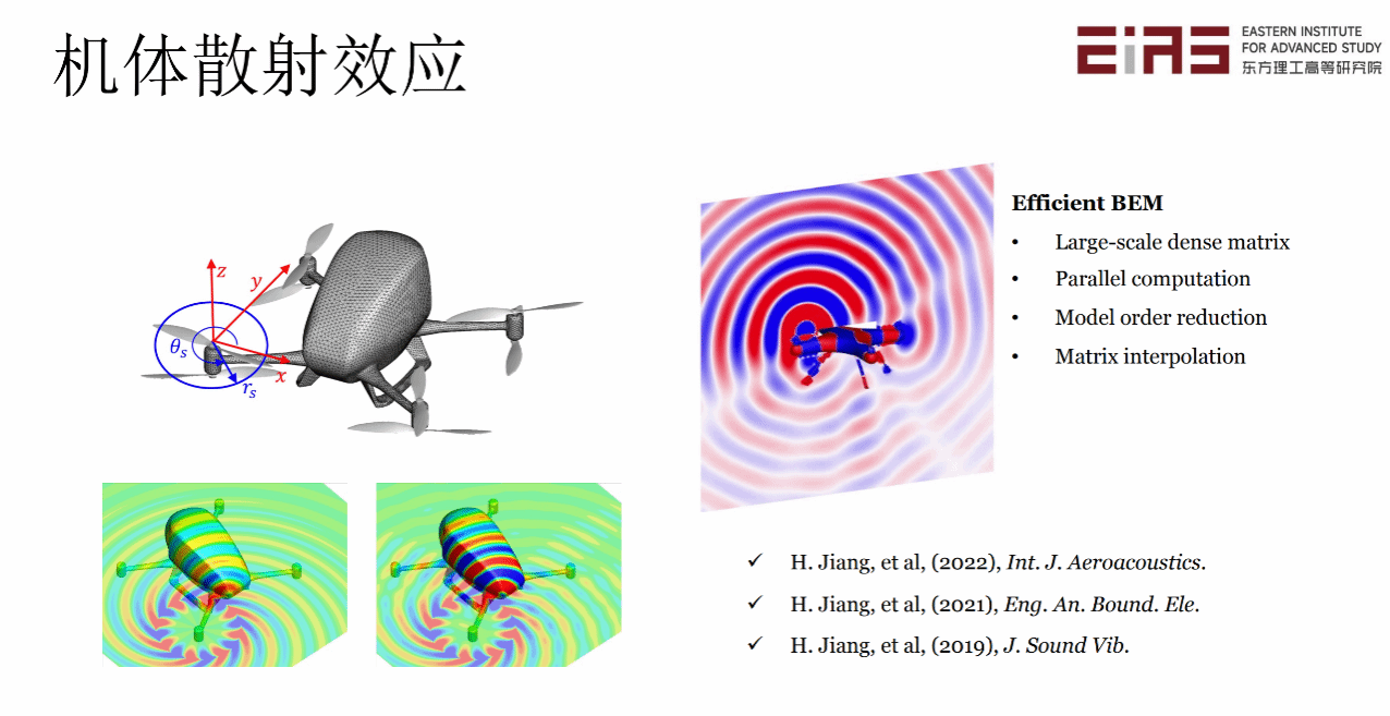 然后,姜汉博副研究员对机体散射效应进行了介绍,主要讲述了基于插值和模型降阶的声学边界元方法。他提出机体部件散射和遮蔽效应可能会显著改变噪声辐射特性,在无人机整体设计时应充分考虑螺旋桨和机体相对位置关系,同时考虑在关键部位安装吸声材料来实现噪声控制。