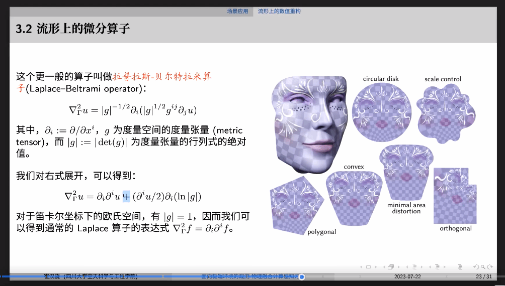 随后,崔汉骁从数据重构的基本原理基础入手,帮助与会学者了解了对有限观测结果和物理模型进行结合的关键步骤。数值重构的难点在于解决方程的病态性,其根源来自于观测过程或者物理过程导致的信息损失。对此,崔汉骁提出一方面可以对测量结果引入某种先验信息进行修正,另一方面则是利用拉格朗日法将原有的刚性约束加入物理模型进行求解。并且,他采用观测数据和物理模型的融合过程推导出了其可能的边界条件,从而借助数值仿真可以完成计算。