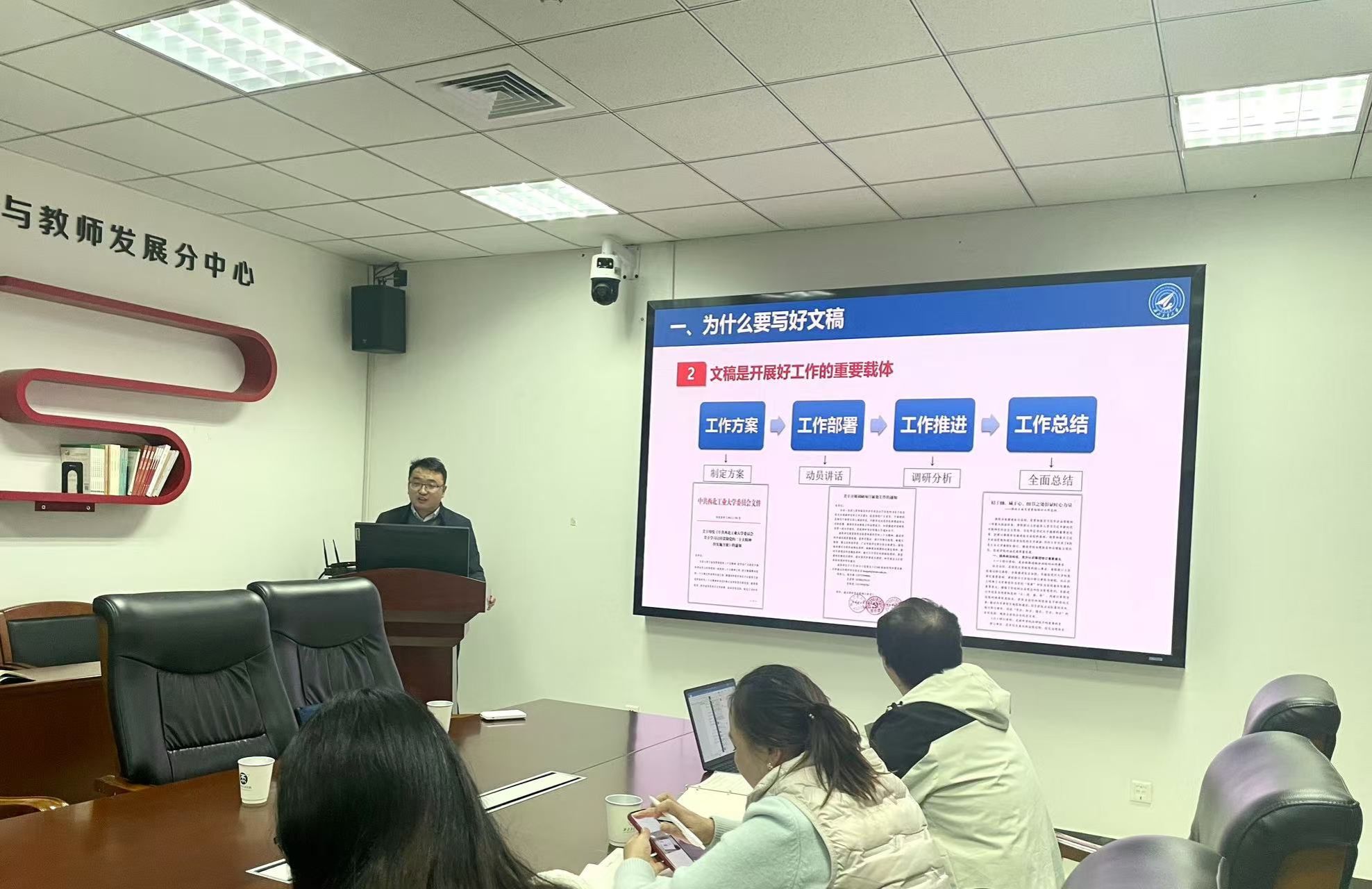 动力与能源学院党委副书记徐永超从为什么要写好文稿,如何写好文稿两方面进行讲解,并以大型报告,工作总结,会议致辞为例详细讲解了文稿写作的方法和要素,深入浅出的见解引发与会成员的思考。